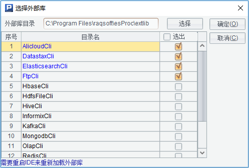 此时点击选择按钮选择外部库文件夹所在的目录,集算器中的外部库文件夹默认放置在【安装目录】\ esProc\extlib下。每个外部库文件夹中应包含对应的润乾外部库核心jar和所需第三方依赖jar,勾选出需要使用的外部库文件夹名称,点击【确定】,重启IDE后生效。