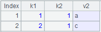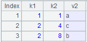 =create(k1,k2,v2).record([1,1,"a",2,4,"c",2,8,"b"]) |