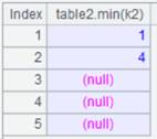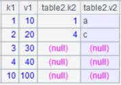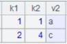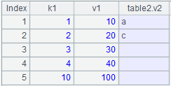 读取组表基表中的列k1、v1及附表table2的列k2、v2,当记录中无k2、v2列时默认用空值。附表中多记录对应基表时取首条记录。