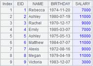 =demo.cursor("select EID,NAME,BIRTHDAY,SALARY from EMPLOYEE where EID<10") |