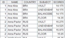 =A2.conj(create(ID,NAME,COUNTRY,SUBJECT,SCORES).record([ID,NAME,COUNTRY,"VAULT",VAULT,ID,NAME,COUNTRY, "UNEVENBARS",UNEVENBARS, ID,NAME,COUNTRY,"BALANCEBEAM",BALANCEBEAM,ID,NAME, COUNTRY,"FLOOR",FLOOR])) |