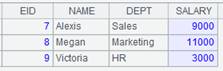 =demo.cursor("select EID,NAME,DEPT,SALARY from EMPLOYEE where EID<10 order by EID" ) |