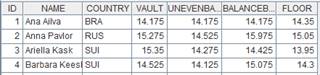 =A1.conj(create(ID,NAME,COUNTRY,SUBJECT,SCORES).record([ID,NAME,COUNTRY,"VAULT",VAULT,ID,NAME,COUNTRY, "UNEVENBARS",UNEVENBARS,ID,NAME,COUNTRY, "BALANCEBEAM",BALANCEBEAM,ID,NAME,COUNTRY,"FLOOR",FLOOR])) |