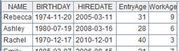 =A3.derive(interval@y(BIRTHDAY,HIREDATE):EntryAge, age(HIREDATE):WorkAge) |