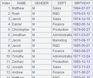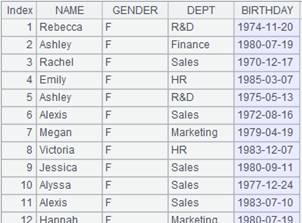 =demo.cursor("select NAME,GENDER,DEPT,BIRTHDAY from EMPLOYEE") |