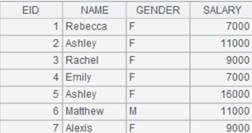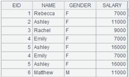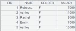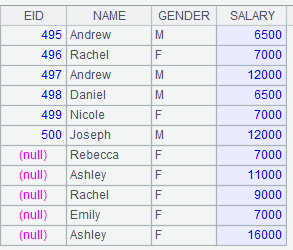 =demo.query("select EID,NAME,GENDER,SALARY from EMPLOYEE where EID<6") |