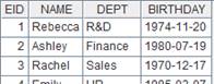 =demo.query("select EID,NAME,DEPT,BIRTHDAY from EMPLOYEE") |