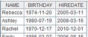 =demo.query("select NAME,BIRTHDAY,HIREDATE from EMPLOYEE") |