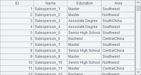 要求有50名销售员,5个地区:华北、华南、华中、西南、西北,4种学历:高中、大专、本科、硕士。