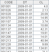 下面是某证券交易所一个月内的日收盘价记录,其中CODE列为股票代码,DT为日期,CL为收盘价。