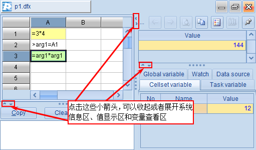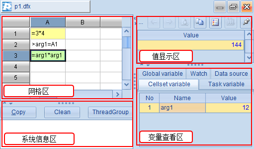 左边上方的网格区是当前活动的网格文件,下方的系统信息区中可以显示系统输出的消息。右边,上部分区域是值显示区,下部分区域是变量查看区。值显示区和变量查看区可以收起和展开。