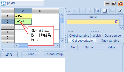在集算器中,如果一个单元格有值,那么在计算格或者执行格中,就可以直接使用单元格名称引用单元格值。有值的单元格可以是常数格、计算格,也可以是被执行格赋值的其它单元格。单元格名称由列号字母和行号整数组成。上面网格中A2中表达式中就调用了A1的值,又如:
