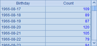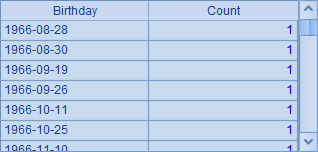 =A2.groupx(Birthday;count(~):Count;1000) |