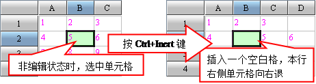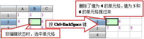 在单元格上按Ctrl-Enter、Ctrl-BackSpace、Ctrl-Delete会产生类似回车换行、退格和删除本格的效果,与文本编辑中按Enter、Backspace、Delete基本相当。按Ctrl-Insert将在本行中插入单元格。
