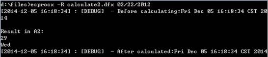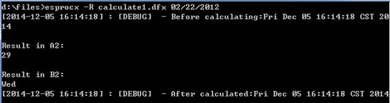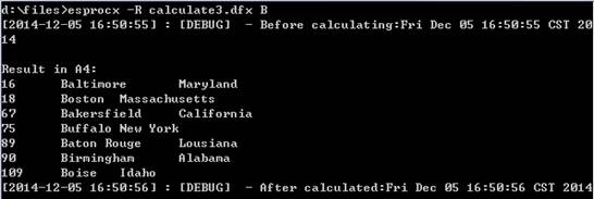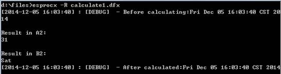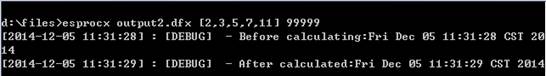 在命令行中直接用esprocx命令,缺省并不会在屏幕上输出结果。如果需要将dfx文件返回的结果显示出来,需要在执行时使用-R选项。首先,和用call函数调用的网格文件类似,在dfx文件中需要返回的数据,必须用return语句返回。如下面的网格文件D:\files\calculate1.dfx: