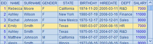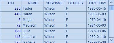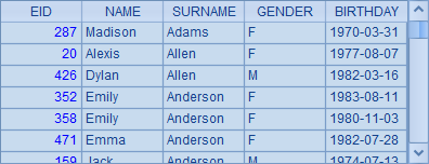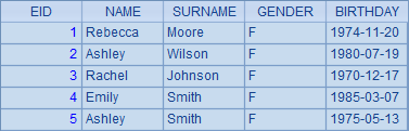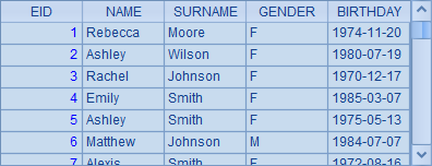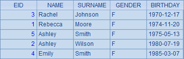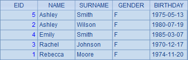=demo.query("select EID,NAME,SURNAME,GENDER, BIRTHDAY from EMPLOYEE") |