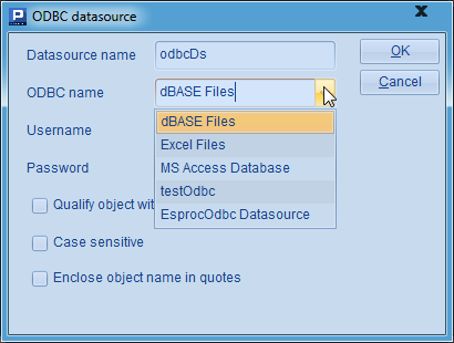 可以从列表中选择配置的ODBC数据源,并配置用户名、密码等相关参数。