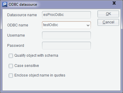 这里的用户名和密码是ODBC数据源的配置,留空即可。添加完毕后,esProc-ODBC数据源即可正常连接: