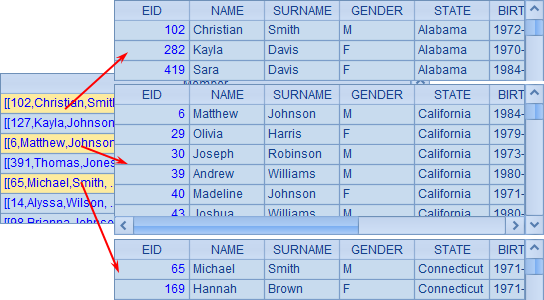 下面网格中的代码,将文本文件sales.txt读入序表A1,取其中的STATE列,生成序列A2,将记录按照STATE分组,生成序列A3: