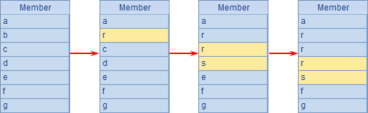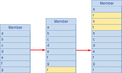 A2在序列结尾新增成员,A3继续在第2个成员之前连续插入3个新成员。仍然使用分步执行,A1中序列的变化如下: