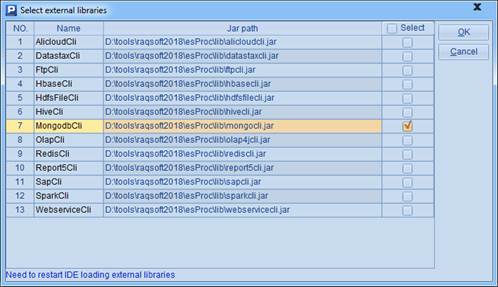 在集算器安装后,在集算器安装目录的esProc\lib路径下,附带了一些支持外部库的jar包,包括:阿里云(alicloudcli.jar)、HBASE数据库(hbasecli.jar)、HDFS数据库(hdfsfilecli.jar)、Hive数据库(hivecli.jar)、DataStax数据库/Cassandra(datastaxcli.jar)、FTP服务(ftpcli.jar)、MongoDB(mongocli.jar)、多维数据库(olap4jcli.jar)、redis数据库(rediscli.jar)、润乾report5(report5cli.jar)、SAP(sapcli.jar)、Apache Spark(sparkcli.jar)、Web Service服务(webservicecli.jar)。