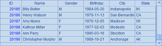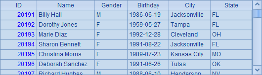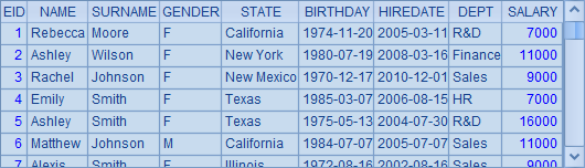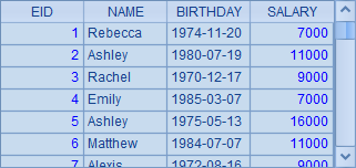 在A2中,读入数据时,指定EID字段为字符串,BIRTHDAY为日期,SALARY为整数。执行后,A2中序表如下: