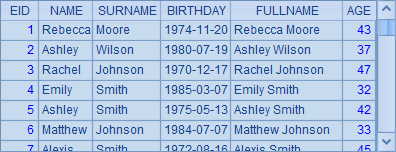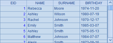 =demo.query("select EID, NAME, SURNAME, BIRTHDAY from EMPLOYEE") |