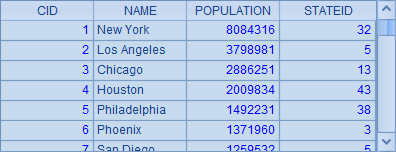 CITIES通过STATEID字段和STATES关联。数据库中的这种存储模式可以使得数据保持一致,易于维护,同时也节省了存储空间。