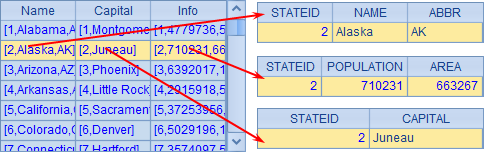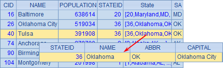 =A2.derive(A1.select(STATEID==A2.STATEID):Cities) |