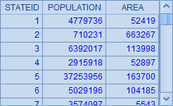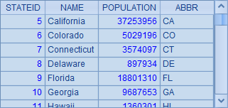 =demo.query("select STATEID,NAME,POPULATION,ABBR from STATES order by STATEID") |