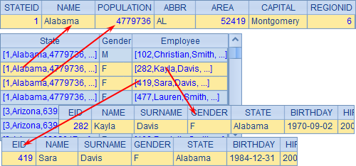 在A6中,查询出Alabama州所引用的各层外键,结果如下: