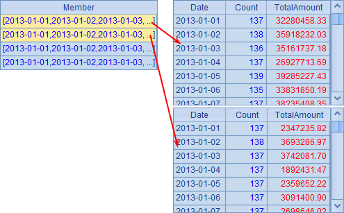 由于在使用cs.groups() 函数对游标分组聚合时,会根据分组值排序,所以对每类商品分组聚合后,无论原始数据的顺序如何,结果序表都是对时间有序的。这样,就可以进一步将结果归并,计算出所有商品每天的订单数据: