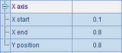 在默认情况下,横轴的属性中X start为0.1,X end为0.8,横轴的纵向位置Y position为0.8,均为按比例设定的物理轴坐标,均以左上角为原点。即这个横轴的起始点在画布左起20%的位置,终止点在画布左起80%的位置,横轴的位置在上面起80%的位置,图形绘制结果如下: