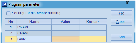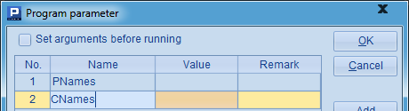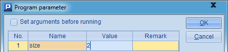 在这里,B2循环在A2中添加字符,随机生成ID,并用return语句返回。与调用子程序时类似,在跨网格调用时,也可以不使用return语句,此时将返回最后一个以=开头的计算格的值。如可以将A3中的代码改为=A2,结果是一样的。需要注意到,在B2中用到了参数size,这是一个网格参数,需要在菜单栏中点击Program>Parameter设置:
