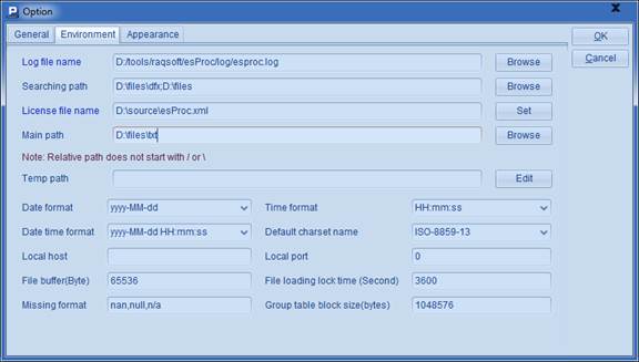 如果使用A2中的写法,需要保证dfx文件置于集算器的主路径或者寻址路径中。在菜单栏中点击Tool>Options,在选项设定的Environment页面中,可以设定主路径和寻址路径,如: