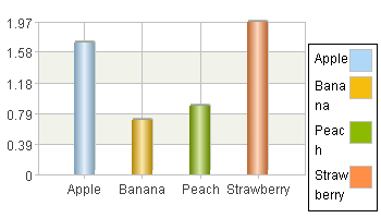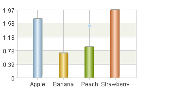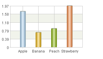 A3绘制白色背景;A4中设定横轴x为枚举轴,并设定分类序列为水果名称构成的序列;A5中设定纵轴y为数值轴,自动计算值域;A6中绘制柱图,绘制的逻辑坐标为水果名称和水果单价。A8绘制结果如下: