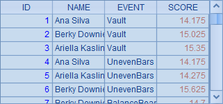 =demo.query("select * from GYMSCORE where EVENT = 'Vault'") |