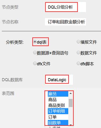 选择节点类型为DQL分组分析,分析类型使用dql表,选择雇员、订单明细、回款单三个表(ctrl多选):
