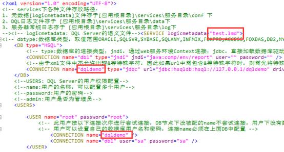 1) service.xml用于为DQL SERVER配置元数据文件(*.lmd)和DQL SERVER的物理数据库连接信息。元数据文件应部署在DQL SERVER的【services->服务目录->conf】下。