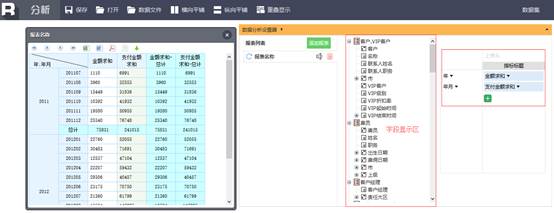 如上图所示拖拽回款金额和支付金额到指标区域中,然后拖拽支付单和回款单中日期所对应的公共的年和年月维度到左表头,左侧分析报表就展现出来了。