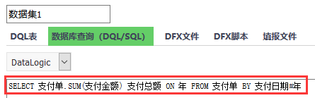 创建数据集时DQL元数据层会自动从已有的支付供应商月汇总的数据中进一步汇总,即执行以下SQL:SELECT CAST(T_1_1."年月"/100 AS INT) "年",SUM(T_1_1."支付总额") "支付总额" FROM "支付供应商月汇总" T_1_1 GROUP BY CAST(T_1_1."年月"/100 AS INT),通过对基础表的设定,可以充分利用事先汇总完成的数据,以提高效率。