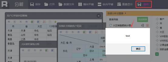 例如用户如果想在分析界面demo上方的toolbar工具条上添加一个名为"自定义保存按钮"的保存olap的按钮,则可通过如下代码实现: