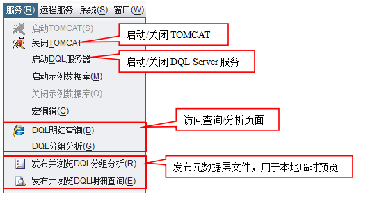 安装了润乾报表V2018后,产品里自带一全套基于HSQL数据库的元数据层文件和与之关联的DQL Server服务和DEMO应用。在DQL元数据层设计器里,可以通过【服务】菜单,启动内置的TOMCAT服务和DQL Server服务,启动DQL Server时会自动将产品自带的DQL Server所引用的HSQL数据库启动。