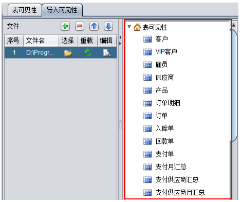引用外部可视文件,将可视文件中的表引入到当前可视文件中,可对所选择的文件进行重新加载或编辑操作。导入完成后新引入的可视文件中的表会添加显示在右侧表项列表中,如下图所示: