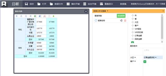 通过上述方法选择数据文件后,多维分析最重要的一步数据集创建完成。接下来就是业务人员自由发挥时间了,随意在复杂条件中拖拽表头和指标,想查什么查什么,想算什么算什么。如下图所示对大区和客户的订单金额求和,则依次拖拽大区和客户字段到左表头,然后在指标区对订单金额求和。