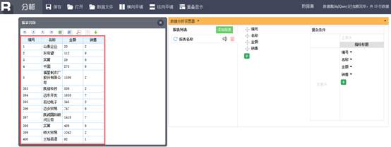 查询控件中选择使用多物理库的DQL Server服务,拖拽查询字段,做混合查询: