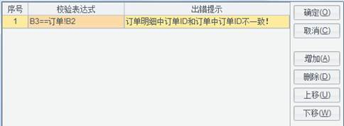 切换到订单明细sheet,选中B3单元格,打开【填报】->【单元格校验】,编辑校验表达式和出错提示,如下图所示: