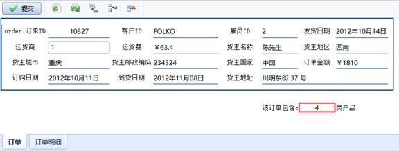 以5.1.sht为例,如果我们想在订单sheet中显示该订单包含多少种产品,那么我们可以选中订单sheet中的G11单元格,编辑表达式为=count({订单明细!C3}),自动计算结果如下图所示:
