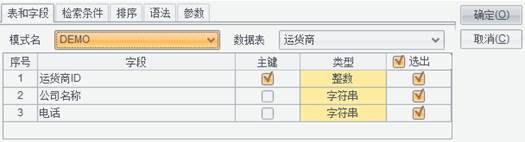 字段列表框中自动列出“运货商”的所有字段。在字段列表框选择主键“运货商ID”,并选出全部字段,点击确定。