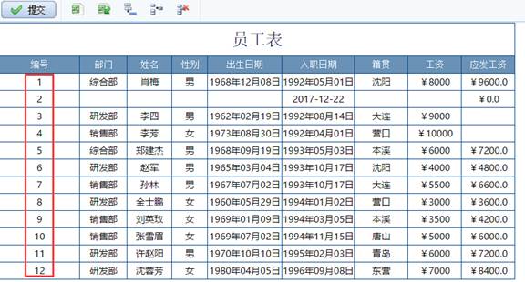 为填报表增加一列,列值等于行序号,行序号自动生成,数据行有增删时序号值会动态改变,序号格作为数值格处理,但是不可填写。填报提交的结果会自动拼上序号格列。